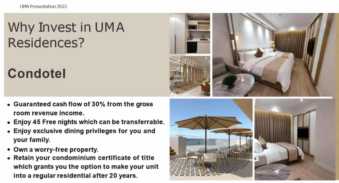 UMA Residences is a hotel and condominium (condotel) development located along Magsaysay Avenue, Brgy. Concepcion Pequeña, Naga City, Camarines Sur. It combines residential condo living with hotel-style services, making it ideal for both homeowners and investors.