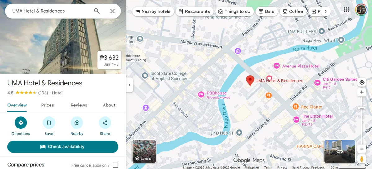 Positioned beside the historic Naga River in the city center